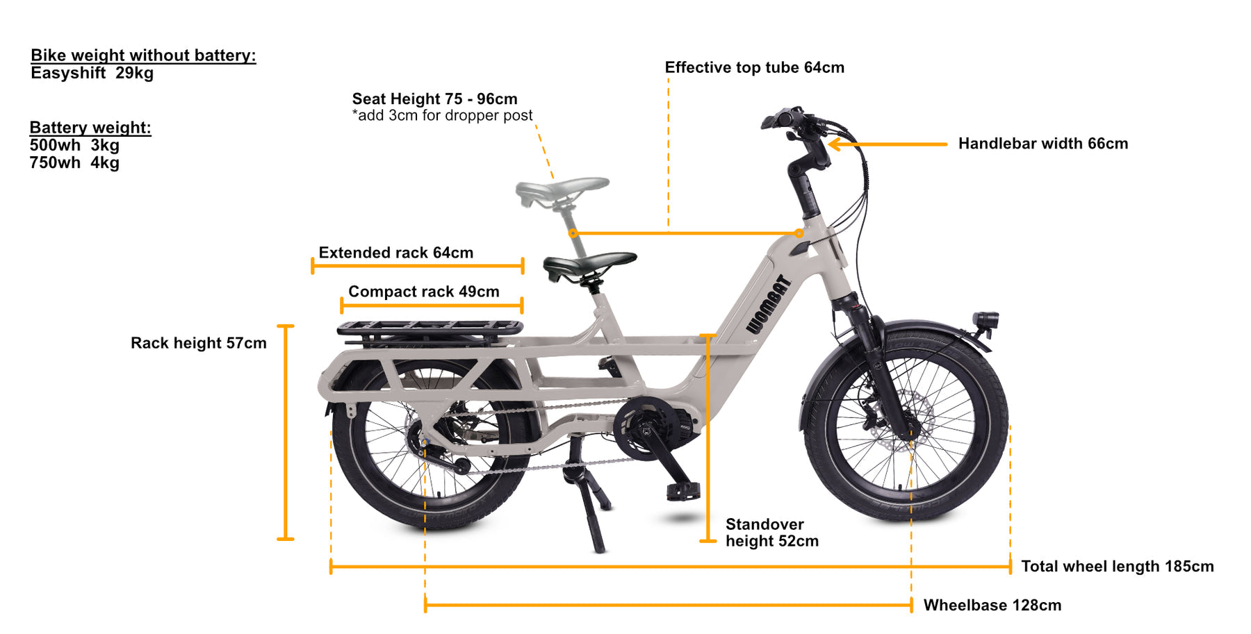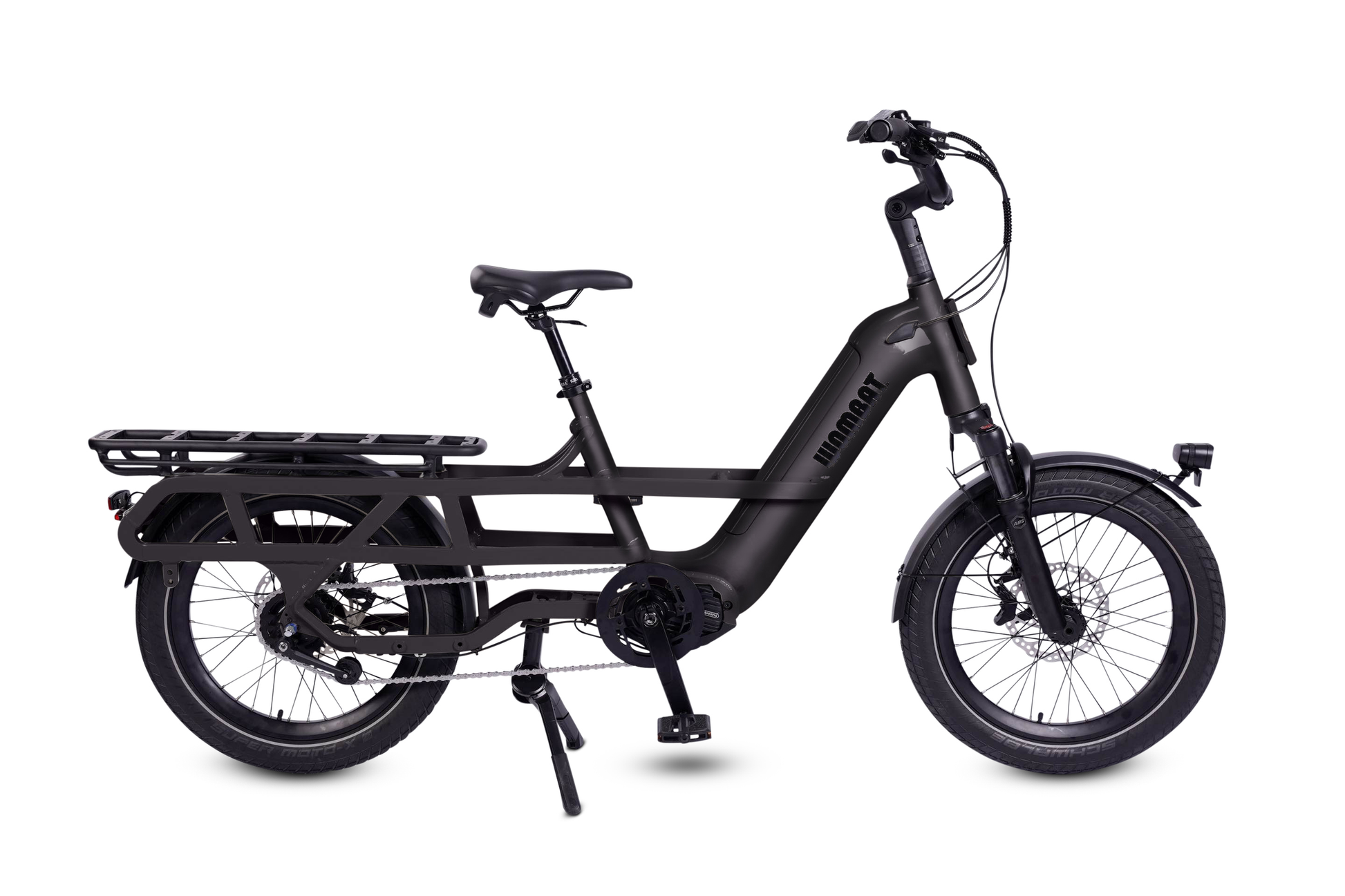 Introducing the all new WOMBAT Rally! Smaller 20" wheels create a super stable ride, with a low centre of gravity that helps to keep your passengers balanced! Built with the same high-grade components you will find across the WOMBAT range, including Schwalbe MOTO-X tyres, RST cargo-rated front suspension, Tektro 4-piston brakes and the latest internally geared hub from Shimano - the Ebike rated 5 speed Nexus.